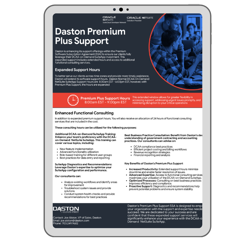 Thank you for your interest in Daston and Premium Plus Support for our DCAA on Demand NetSuite SuiteApp. We have received your intake form and our NetSuite experts will be in touch shortly to discuss with you the next steps in your journey to upgrade your support. In the meantime, please download our .pdf overview our Premium Plus Support for your review.